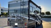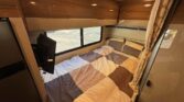 Rear corner bed with adjustable headrest, privacy curtain, and 12V/110V TV.